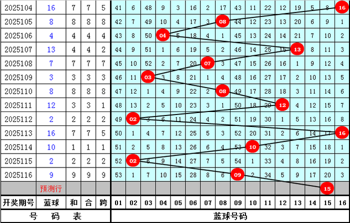 蓝球推荐:蓝球上期开出奖号09,为奇数蓝球,本期预计蓝球继续开出奇数号码,蓝球参考03、11、13、15、16。