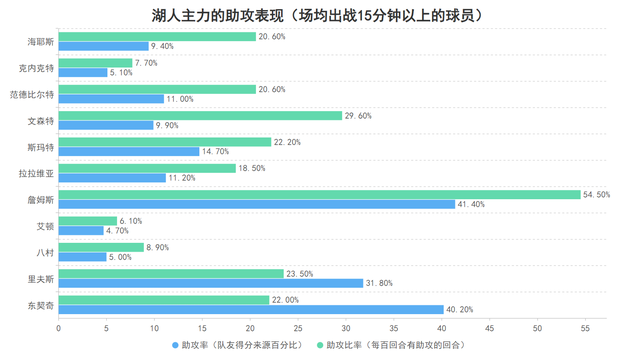 那么詹姆斯是如何做到融入这支新湖人体系的呢?其一是他充当了球队进攻的润滑剂,此战的詹姆斯并不像巅峰时期长时间持球阅读防守再选择得分或助攻,而是寻找对手防线的弱环接到传球后立刻做出球权的二次处理再分配,此战的詹姆斯助攻率与助攻比率分别高达41.4%与54.5%,这意味着队友有41.4%的得分来自詹姆斯的助攻,同时詹姆斯在场时每百回合有54.5个回合都有助攻,高效的助攻成为了转型后的詹姆斯做出的贡献。