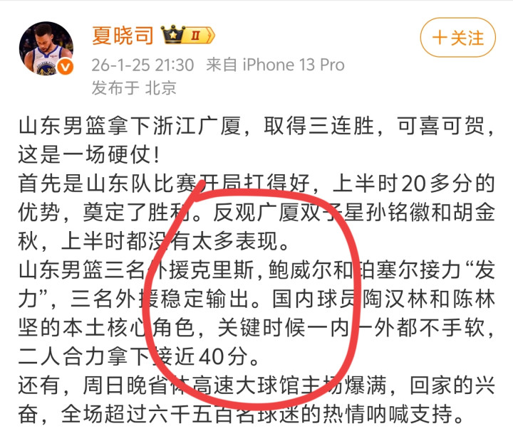 山东电视台记者夏晓司一针见血地表示: "首先是山东队比赛开局打得好,上半时20多分的优势,奠定了胜利。反观广厦双子星孙铭徽和胡金秋,上半时都没有太多表现。山东男篮三名外援克里斯、鲍威尔和珀塞尔接力'发力',三名外援稳定输出。国内球员陶汉林和陈林坚的本土核心角色,关键时候一内一外都不手软,二人合力拿下接近40分。"