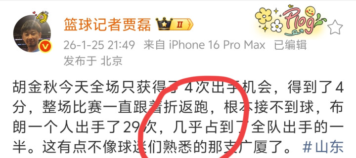 篮球记者贾磊表示: "胡金秋今天全场只获得了4次出手机会,得到了4分,整场比赛一直跟着折返跑,根本接不到球,布朗一个人出手了29次,几乎占到了全队出手的一半。这有点不像球迷们熟悉的那支广厦了。"