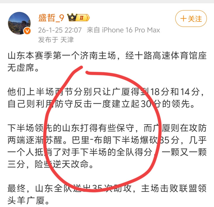 天津体育博主"盛哲_9"表示: "山东本赛季第一个济南主场,经十路高速体育馆座无虚席。他们上半场两节分别只让广厦得到18分和14分,自己则利用防守反击一度建立起30分的领先。下半场领先的山东打得有些保守,而广厦则在攻防两端逐渐苏醒。巴里-布朗下半场爆砍35分,几乎一个人抵消了对手下半场的全队得分,一颗又一颗三分,险些逆天改命。最终,山东全队送出35次助攻,主场击败联盟领头羊广厦。"